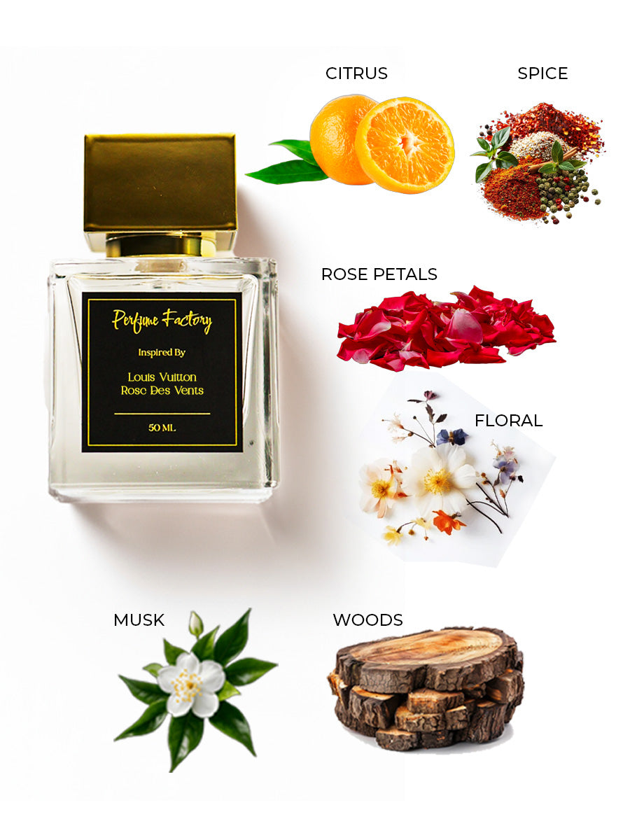 Louis Vuitton Rose Des Vents is a luminous floral composition that celebrates the elegance of rose. It opens with a fresh burst of citrus and subtle spice, leading to a heart of velvety rose petals interlaced with delicate floral nuances. The fragrance settles into a refined base of soft musk and warm woods, leaving an enduring impression of sophistication.