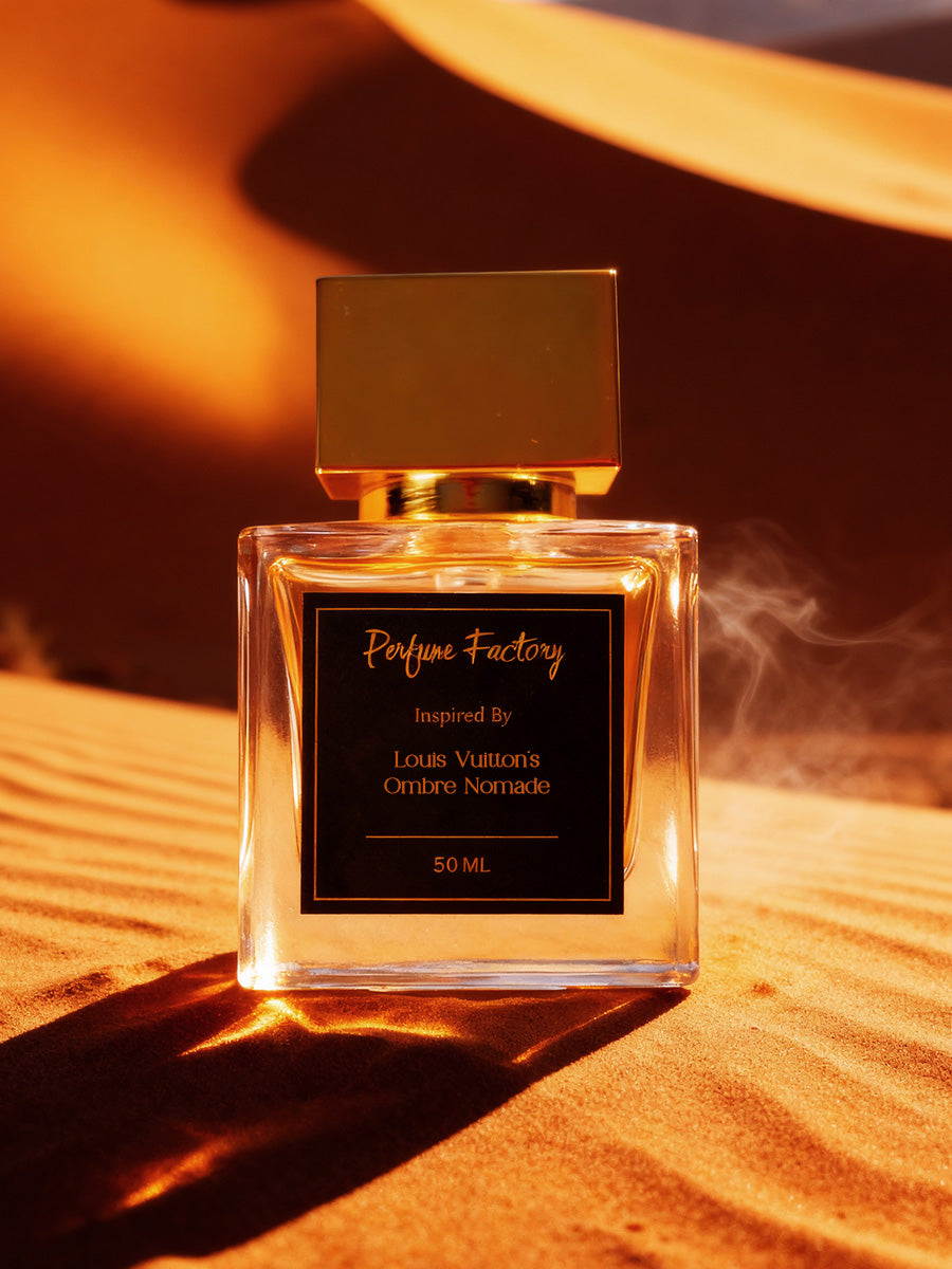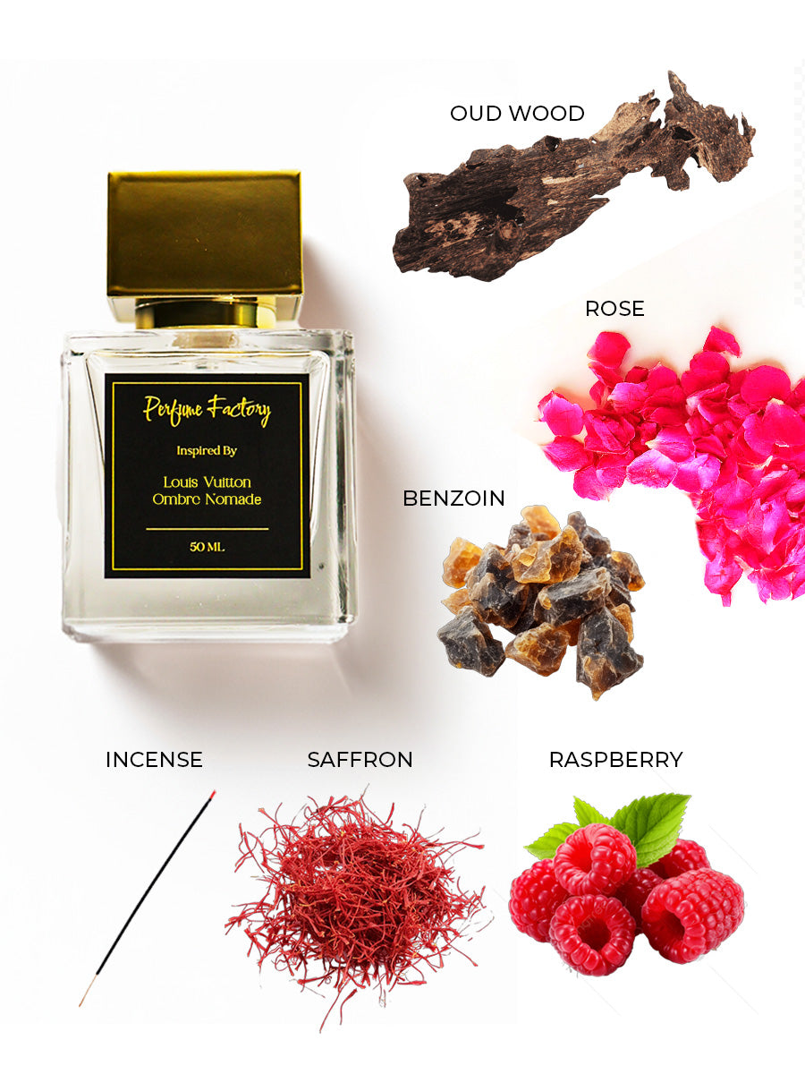 Ombre Nomade by Louis Vuitton is an intense oriental woody fragrance that opens with a bold burst of raspberry, saffron, and incense. A smoky heart of rose, geranium, and birch leads to a deep, mystical base of agarwood (oud), benzoin, and amberwood.